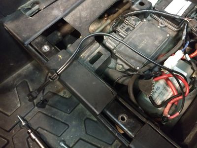 I first removed the drivers seat, then the seat bracket. I then removed the small plastic panel to gain access to the battery. I installed a universal battery charging adapter onto the battery. I then ran the wire from the battery compartment, and then closed the plastic cover. I then installed the seat bracket but make sure to keep the battery lead between the two front bolts, thus allowing the battery charging plug to run under the seat and out the front. This way when you need to charge the battery or jump it, you can just access the plug and you are ready to go.