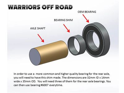 Here is a great tip for you looking to replace worn out rear axle bearings and replace with a higher quality one you will find they are a unique size only to HiSUN. Have some bearing shims made, then you will be able to use a more common and reliable bearing #6007. You will need to have three of them made as there are three bearings in the rear axle. The shim size should be 32mm ID with 35mm OD and 14mm wide. No one makes a direct replacement bearing except HiSUN, and they are not of the highest quality.